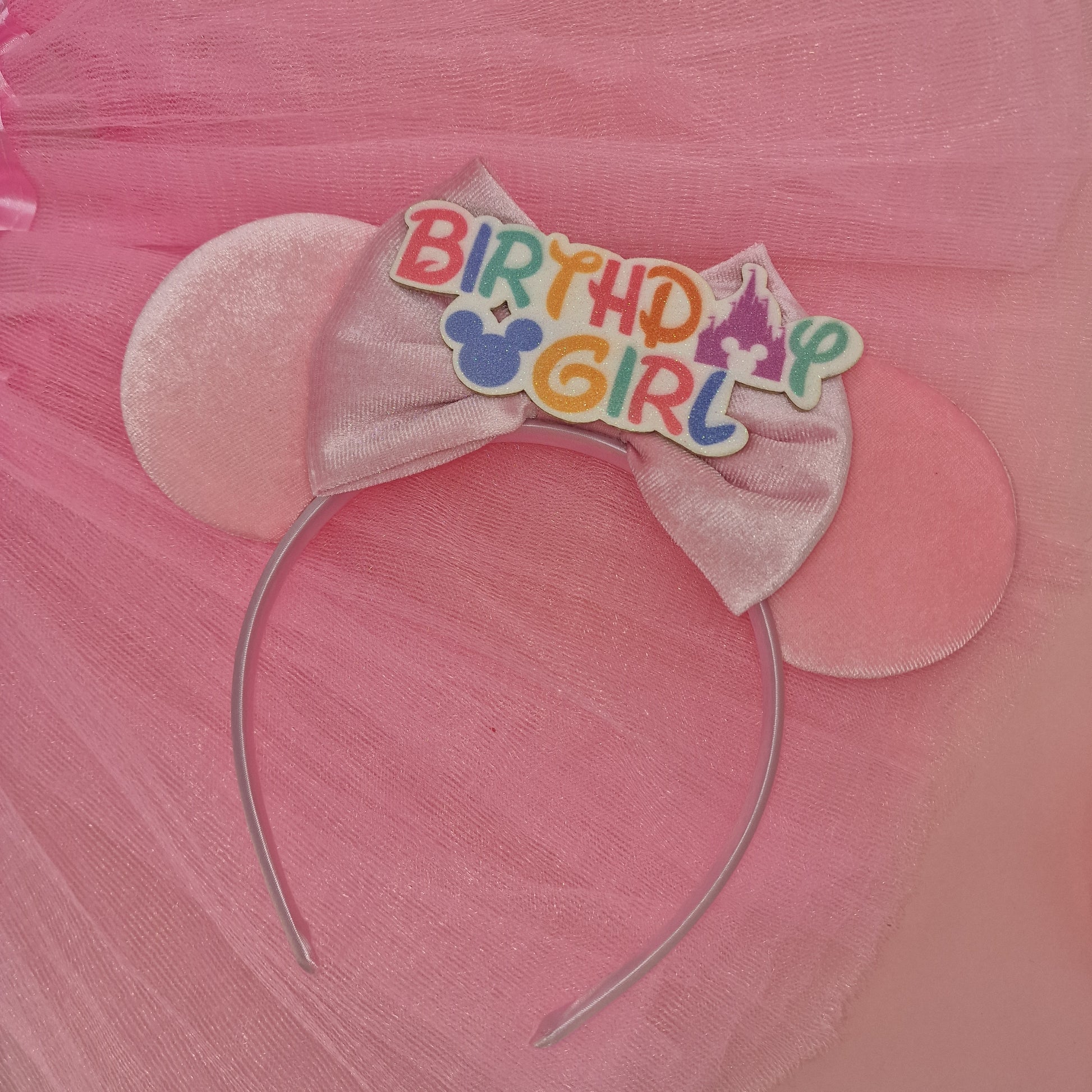 Gorgeous pink velvety mouse ears with a bow and glitter 'Birthday Girl' design